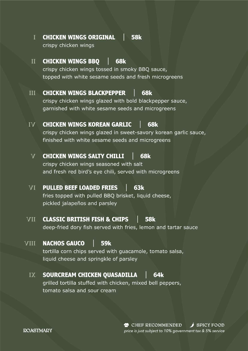 - Small Bites: Offers light snacks and appetizers including nachos served with guacamole and tomato salsa, Rendang Tacos with pulled beef rendang and spicy sambal, mozzarella sticks with aioli sauce, and crumbed prawns served with dipping sauces.